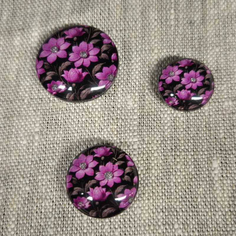 En vacker dekorknapp med ett blommigt mönster i lila och svarta toner som ger en stilfull och livfull touch till dina plagg och projekt. Knappens glansiga yta och undersydda design gör den enkel att fästa samtidigt som den blir ett framträdande dekorativt inslag. Perfekt för grövre plagg som kappor, koftor, kavajer och andra kreativa projekt.