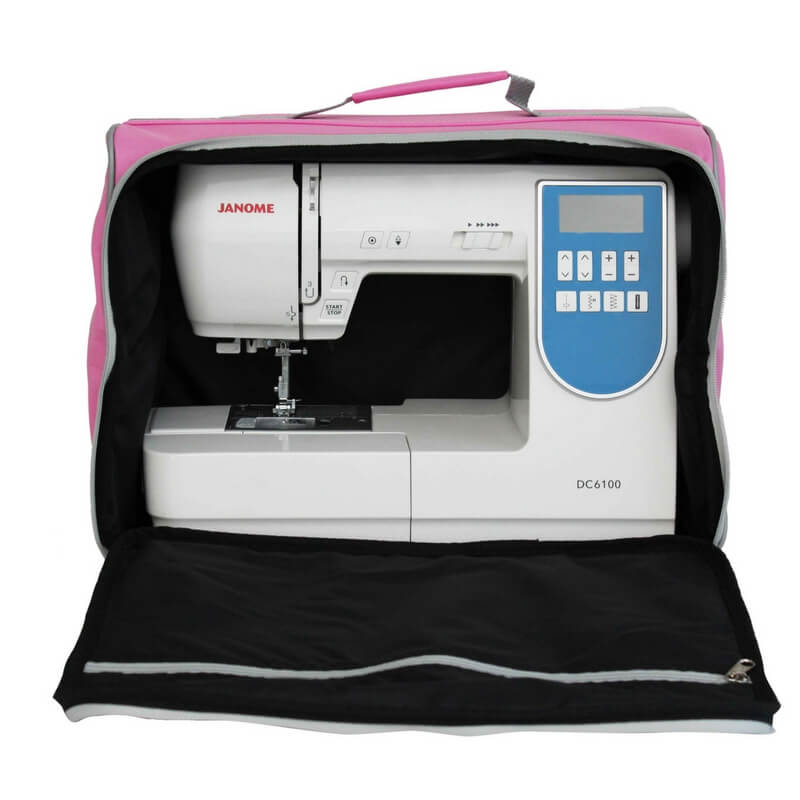 Väskan har en rosa färg med ljusgrå detaljer och är märkt med Janome-loggan. Den är tillverkad för att passa symaskiner med en storlek upp till 45 x 20 x 35 cm.